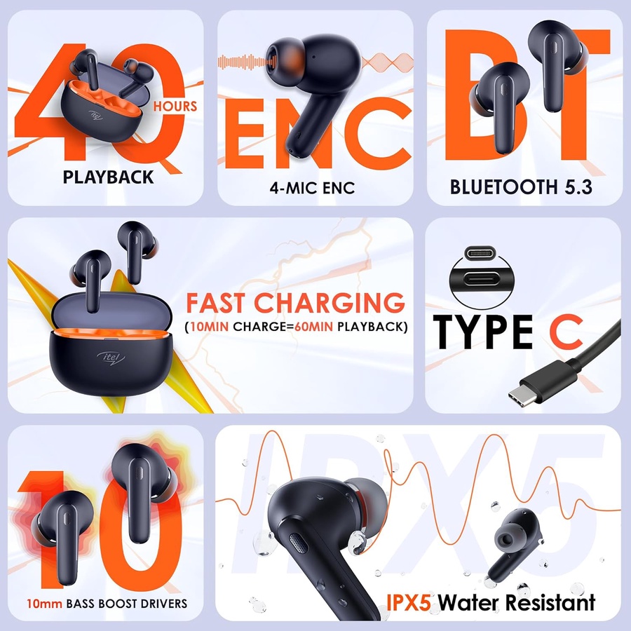 احصل على سماعات itel T11 الأصلية من باسورد موبايل ستور. 40 ساعة تشغيل، تقنية 4-Mic ENC لمكالمات واضحة، وشحن سريع Type-C. أفضل أداء مقابل سعر متاح