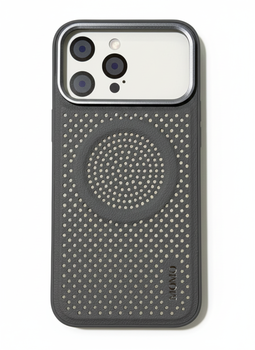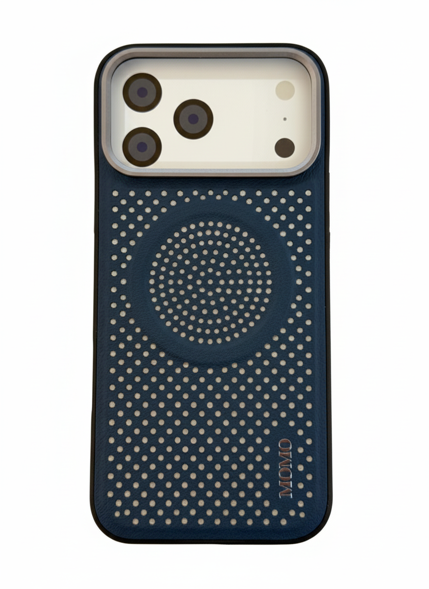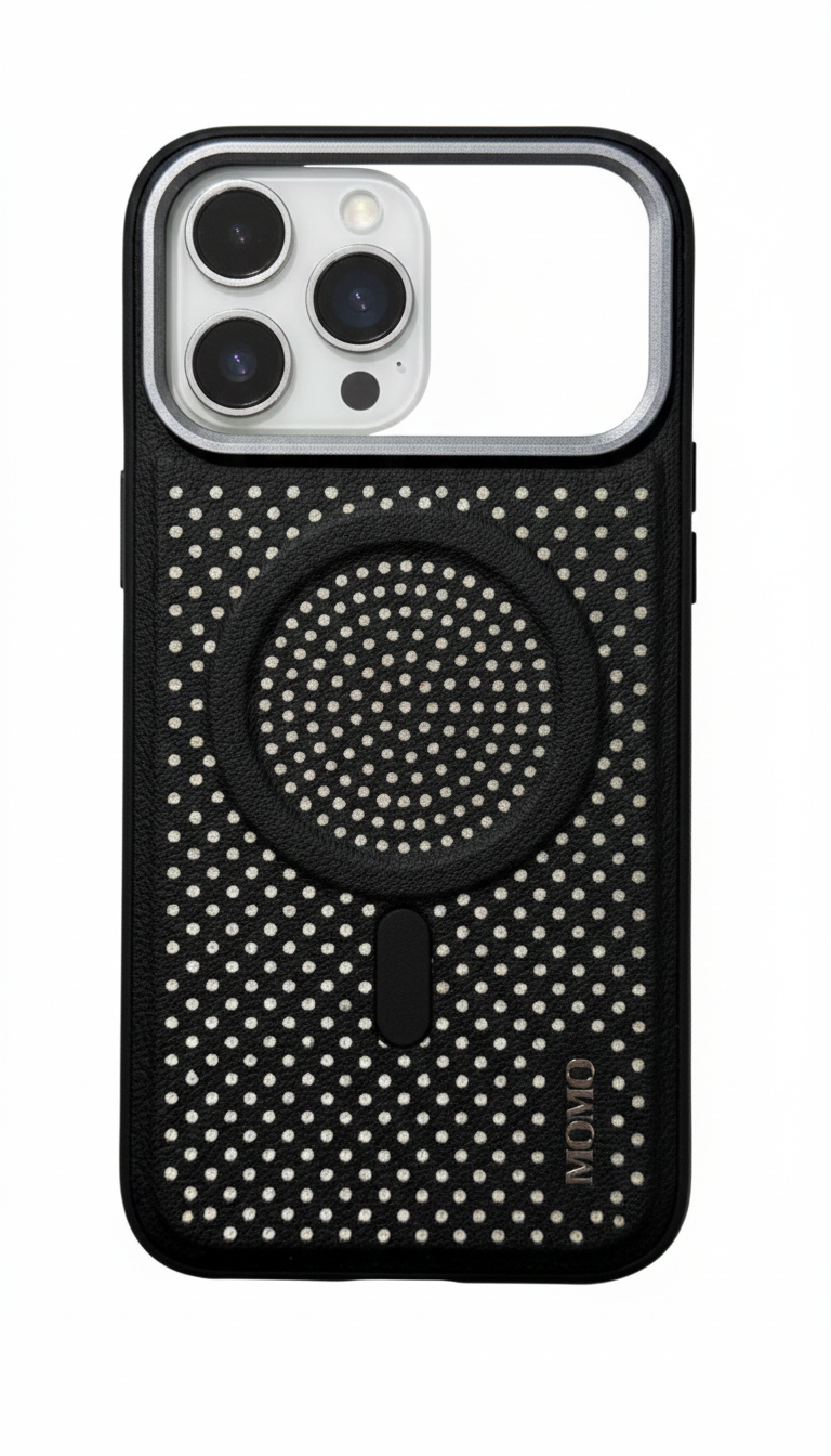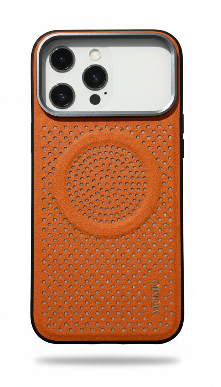 احمي الـ iPhone 17 Pro بجراب MOMO-031 الجلد المخرم من باسورد ستور تصميم يحافظ على برودة الموبايل، يدعم MagSafe، وبفريم حماية للكاميرا. شياكة تليق بموبايلك!
